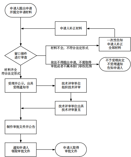 (二)受理:行政许可受理窗口接收申请材料,审批机关应当自收到申请之日起10个工作日内对申请作出处理,将受理通知书或不予受理决定书或补正通知书或不受理告知书送达申请人。