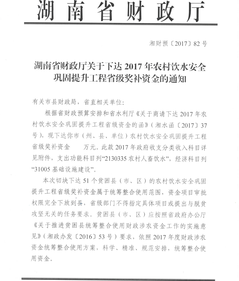 湖南省财政厅关于下达2017年农村饮水安全巩固提升工程省级奖补资金的通知